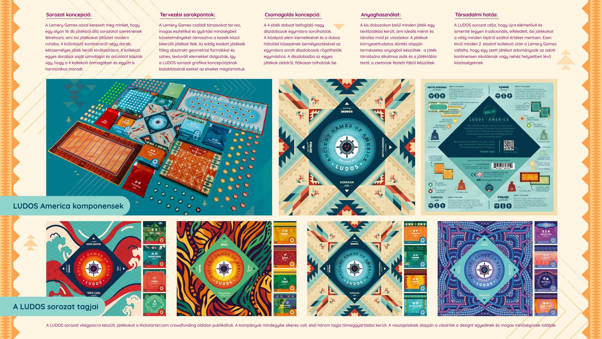 A noppa és a Lemery Games együttműködésében létrejött LUDOS America a LUDOS: The Ancient Games Collection sorozat harmadik kollekciója. A sorozat összesen 16 kétszemélyes játékot foglal magába, kontinensenként négyet, ősi absztrakt játékokat értelmezve újra kortárs formában. A LUDOS America az amerikai kontinenshez kapcsolódó hagyományos játékokat dolgoz fel, a kulturális és történeti háttérhez illeszkedő grafikai rendszerrel. A projekt célja, hogy elfeledett játékokon keresztül mutassa be az egyes kultúrák történeteit és tradícióit. A noppa egy több mint tizenöt éve működő tervezőiroda, amely a grafika és az építészet határterületein alkot, míg a Lemery Games innovatív társasjátékok fejlesztésével foglalkozik. Együttműködésükből több sikeres kampány és tömeggyártott játék született.