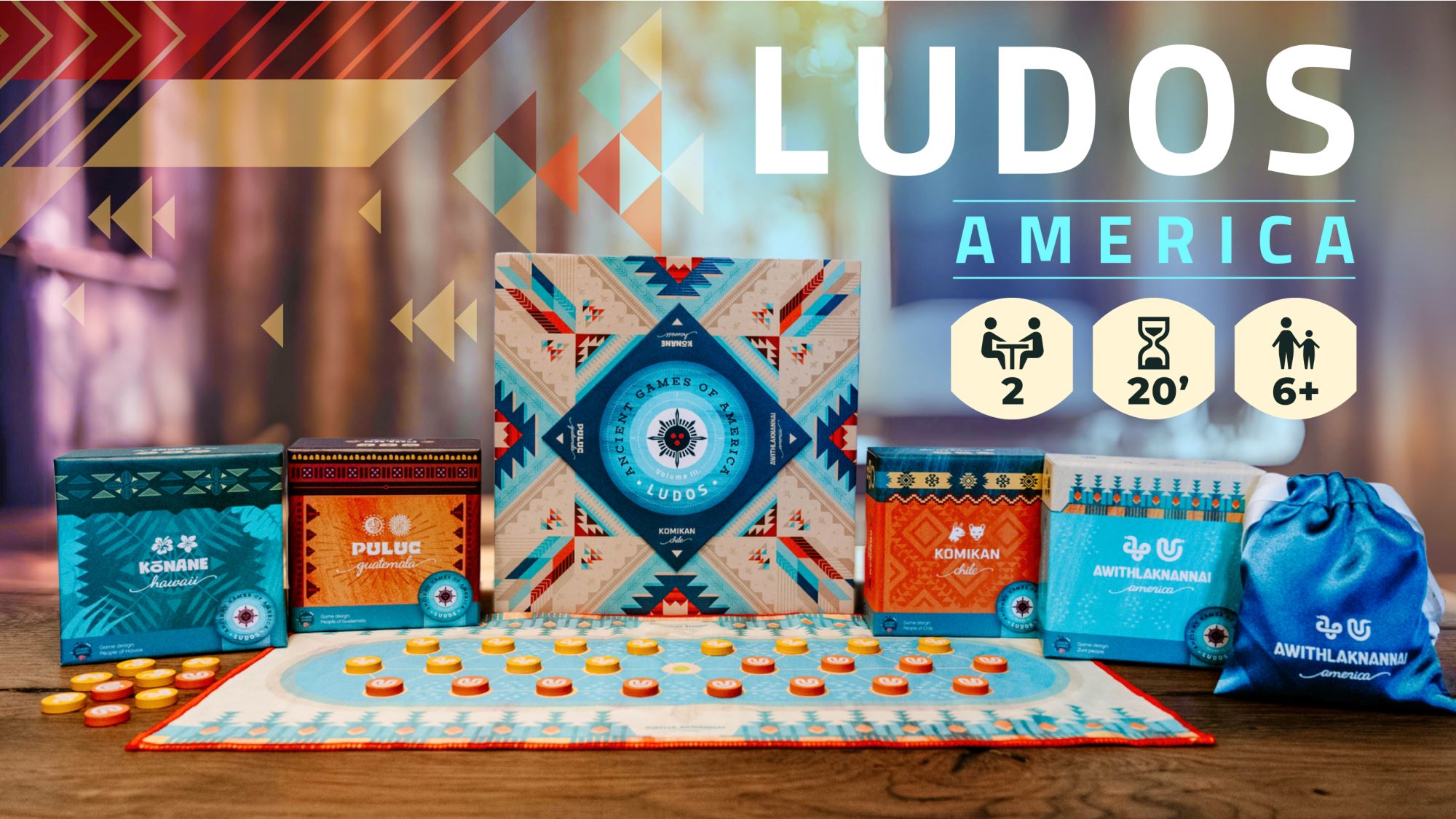 A noppa design és a Lemery Games kollaborációjában készült LUDOS America egy tizenhat darabból álló, kétszemélyes társast tartalmazó sorozat harmadik része. A játék az ősi amerikai kontinens hagyományos játékait dolgozza fel, a kulturális és történeti háttérhez igazodó grafikai rendszerrel.